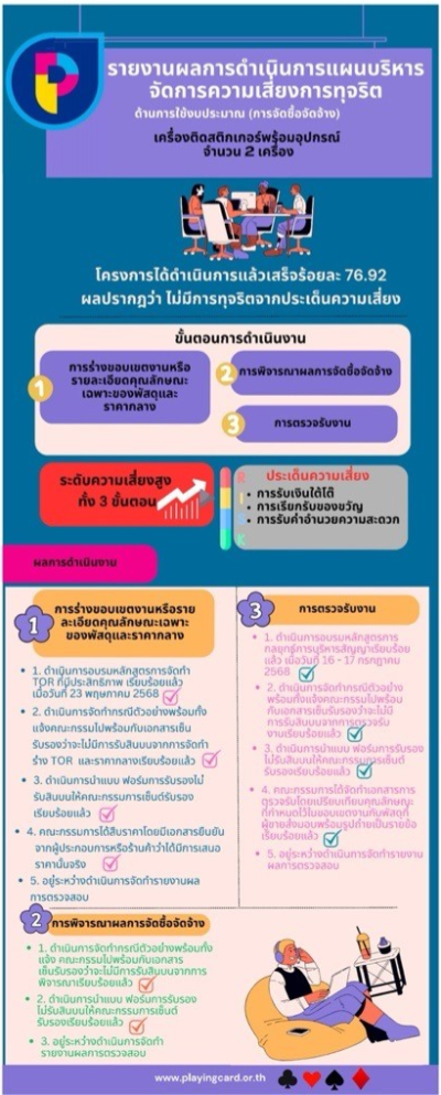 ในวันพุธที่ 7 เมษายน 2564 เวลา 10.00 น. นายภูมิจิตต์  พงษ์พันธุ์งาม ผู้อำนวยการโรงงานไพ่พร้อมด้วยผู้บริหาร ร่วมแสดงสัญลักษณ์ต่อต้านการทุจริตเพื่อเป็นการแสดงเจตนารมณ์และคำมั่นว่าจะปฏิบัติหน้าที่และบริหารงานอย่างซื่อสัตย์สุจริต โปร่งใสและเป็นไปตามหลักธรรมาภิบาล พร้อมทั้งเล็งเห็นความสำคัญในการปรับปรุง พัฒนา และส่งเสริมหน่วยงานในด้านคุณธรรมและความโปร่งใสให้ดียิ่งขึ้นกว่าเดิม