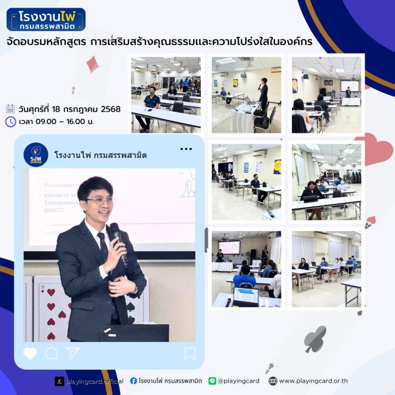 ในวันศุกร์ที่ 18 กรกฎาคม พ.ศ. 2568 เวลา 09.00 – 16.00 น. ผู้บริหาร พนักงาน และคณะทำงานการป้องกันและต่อต้านการทุจริตและด้านคุณธรรม จริยธรรม ของโรงงานไพ่ กรมสรรพสามิต เข้าร่วมการฝึกอบรมหลักสูตร การเสริมสร้างคุณธรรมเเละความโปร่งใสในองค์กรโดยเชิญวิทยากรผู้ทรงคุณวุฒิจากสำนักประเมินคุณธรรมและความโปร่งใส สำนักงาน ป.ป.ช. มาบรรยายให้ความรู้ ณ ห้องประชุมอเนกประสงค์ โรงงานไพ่ กรมสรรพสามิต