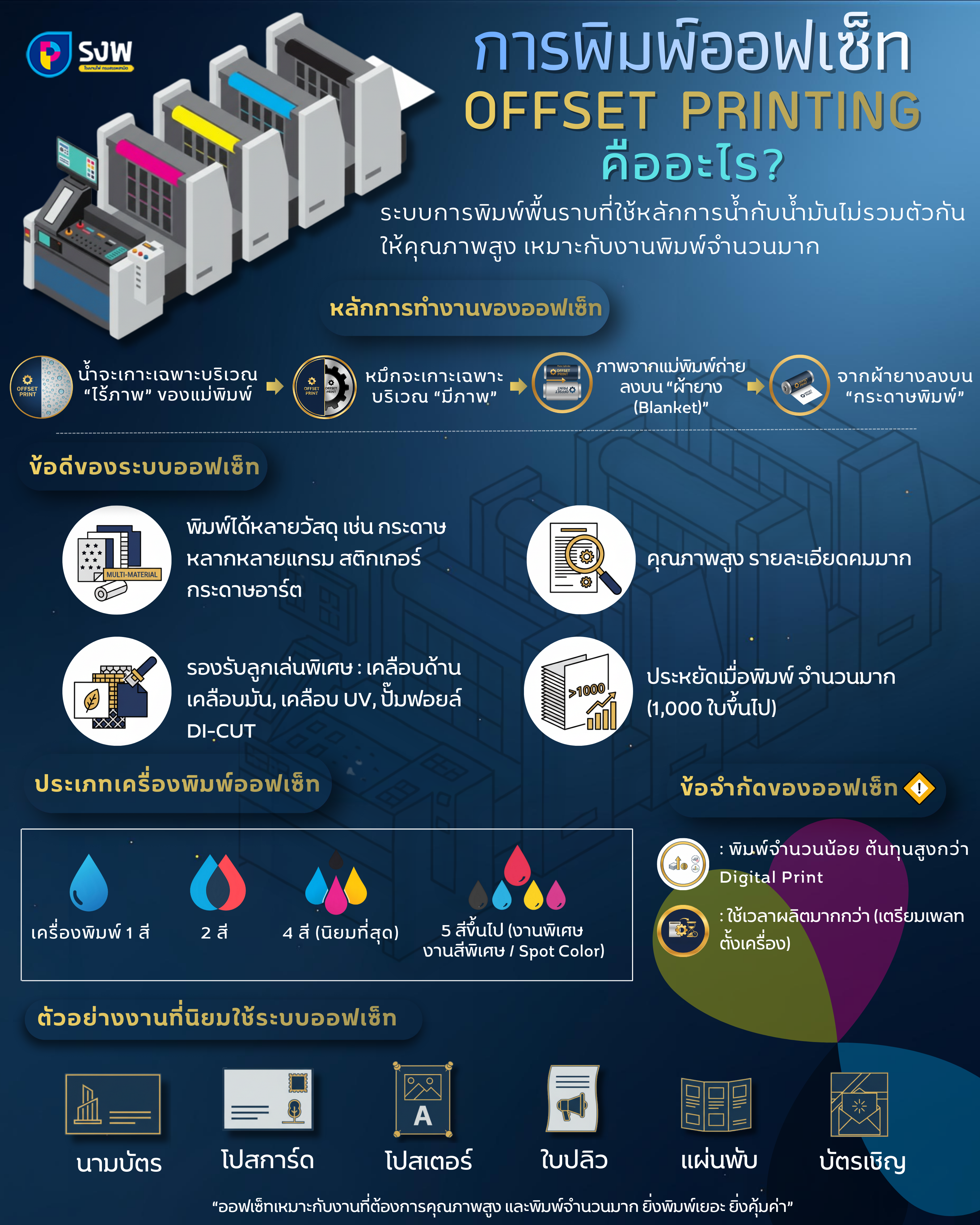 รู้หรือไม่ว่า… ออฟเซ็ทคือสุดยอดเทคนิคที่ใช้หลักการทางวิทยาศาสตร์ของ น้ำกับน้ำมันที่ไม่รวมตัวกัน เพื่อสร้างงานพิมพ์ที่มี รายละเอียดคมชัดและ สีสวยสม่ำเสมอ ตลอดทั้งล็อต !ตัวอย่างงานที่เราใช้ Offset พิมพ์– แผ่นพับ/โบรชัวร์โปรโมชั่น– โปสเตอร์ขนาดต่าง ๆ– นามบัตรพรีเมียม– การ์ดเชิญสำคัญคุณมีโปรเจกต์งานพิมพ์ที่ต้องใช้จำนวนเยอะ ๆ อยู่ไหม? ลองเล่าให้ฟังหน่อยสิว่าอยากพิมพ์อะไร?