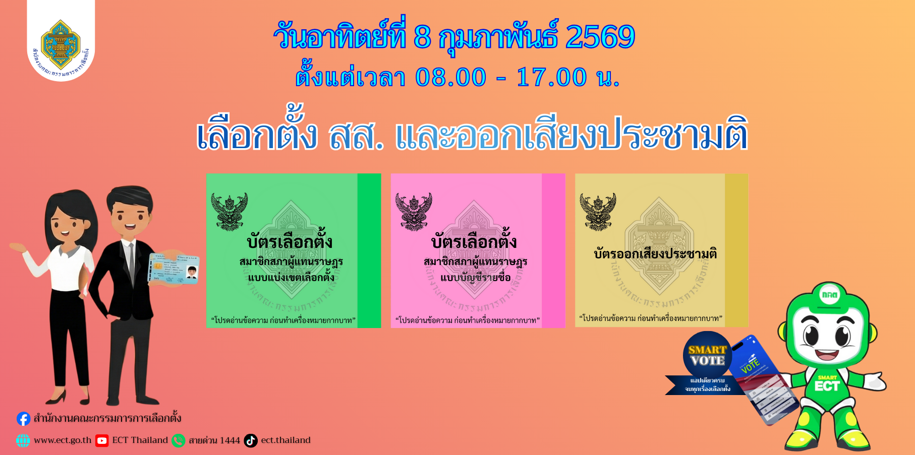 เลือกตั้ง สส. และออกเสียงประชามติ วันอาทิตย์ที่ 8 สิงหาคม 2569 ตั้งแต่เวลา 08.00 – 17.00 น. Kaweesin Nantipatsathit2026-01-08T15:19:17+07:008 มกราคม 2569 |Categories: ข่าวประชาสัมพันธ์| รายละเอียด >>> Views Page : 4 Share FacebookTwitterRedditLinkedInWhatsAppTumblrPinterestVkXingEmail