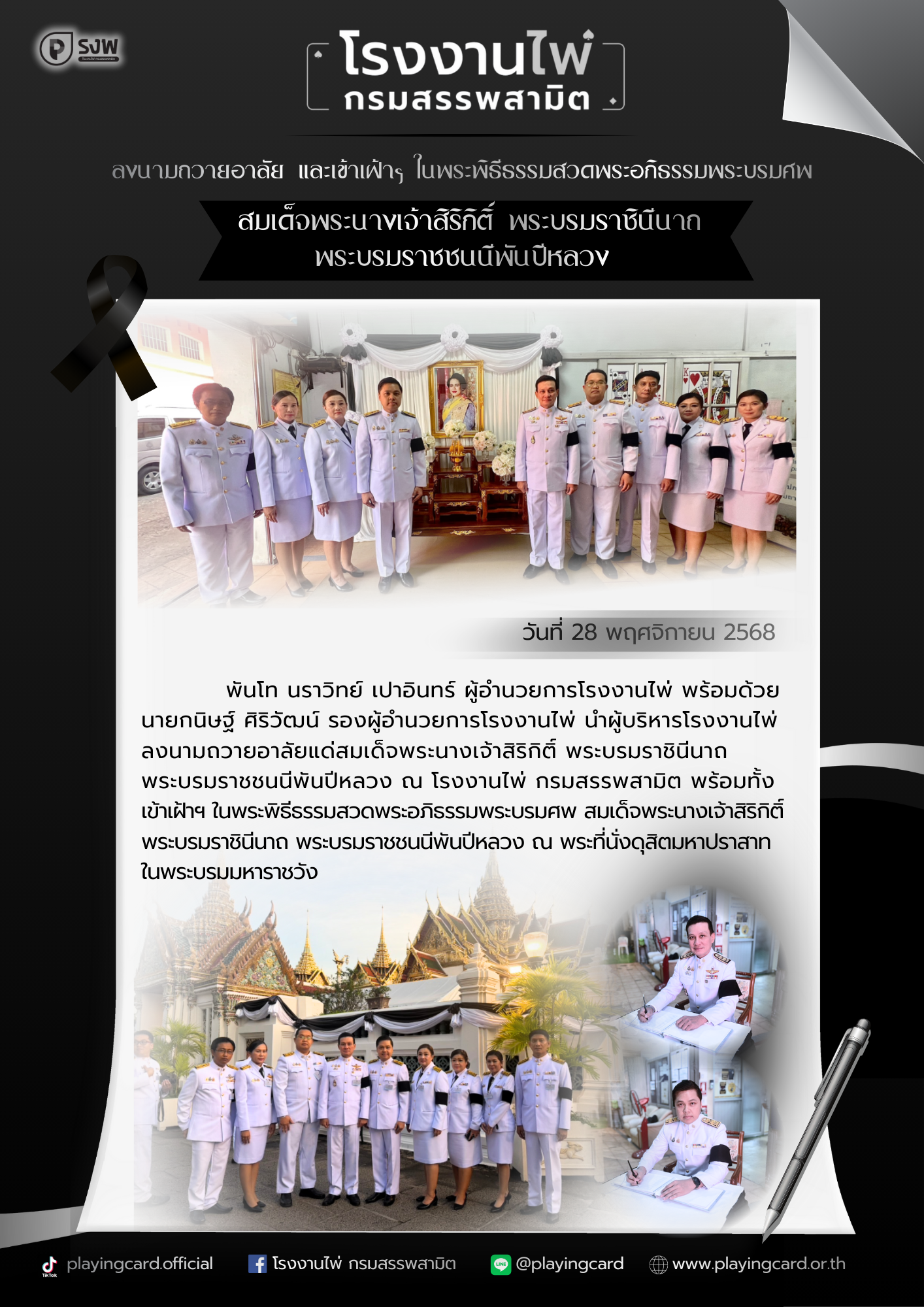 โรงงานไพ่ กรมสรรพสามิต ลงนามถวายอาลัย และเข้าเฝ้าฯ ในพระพิธีธรรมสวดพระอภิธรรมพระบรมศพ สมเด็จพระนางเจ้าสิริกิติ์ พระบรมราชินีนาถ พระบรมราชชนนีพันปีหลวง Kaweesin Nantipatsathit2025-12-22T15:25:11+07:001 ธันวาคม 2568 |Categories: ข่าวกิจกรรม, ข่าวกิจกรรม (ไฮไลท์)| Views Page : 4 Share FacebookTwitterRedditLinkedInWhatsAppTumblrPinterestVkXingEmail