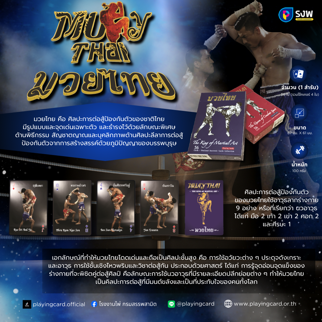 ไพ่มวยไทย เป็นหนึ่งในชุดไพ่ที่ถ่ายทอดเอกลักษณ์ศิลปะการต่อสู้ประจำชาติไทย ผ่านภาพลวดลายและการออกแบบที่ผสานความงดงามของวัฒนธรรมไทยเข้ากับความร่วมสมัย เหมาะทั้งสำหรับการใช้งานทั่วไป การสะสม และการมอบเป็นของที่ระลึกจุดเด่นของไพ่มวยไทย